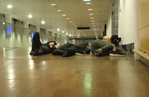 Wir haben versucht die Nacht in Kopenhagen durchzumachen. Um 3 Uhr haben wir aufgegeben, sind zurück zum Flughafen und haben versucht zu schlafen.